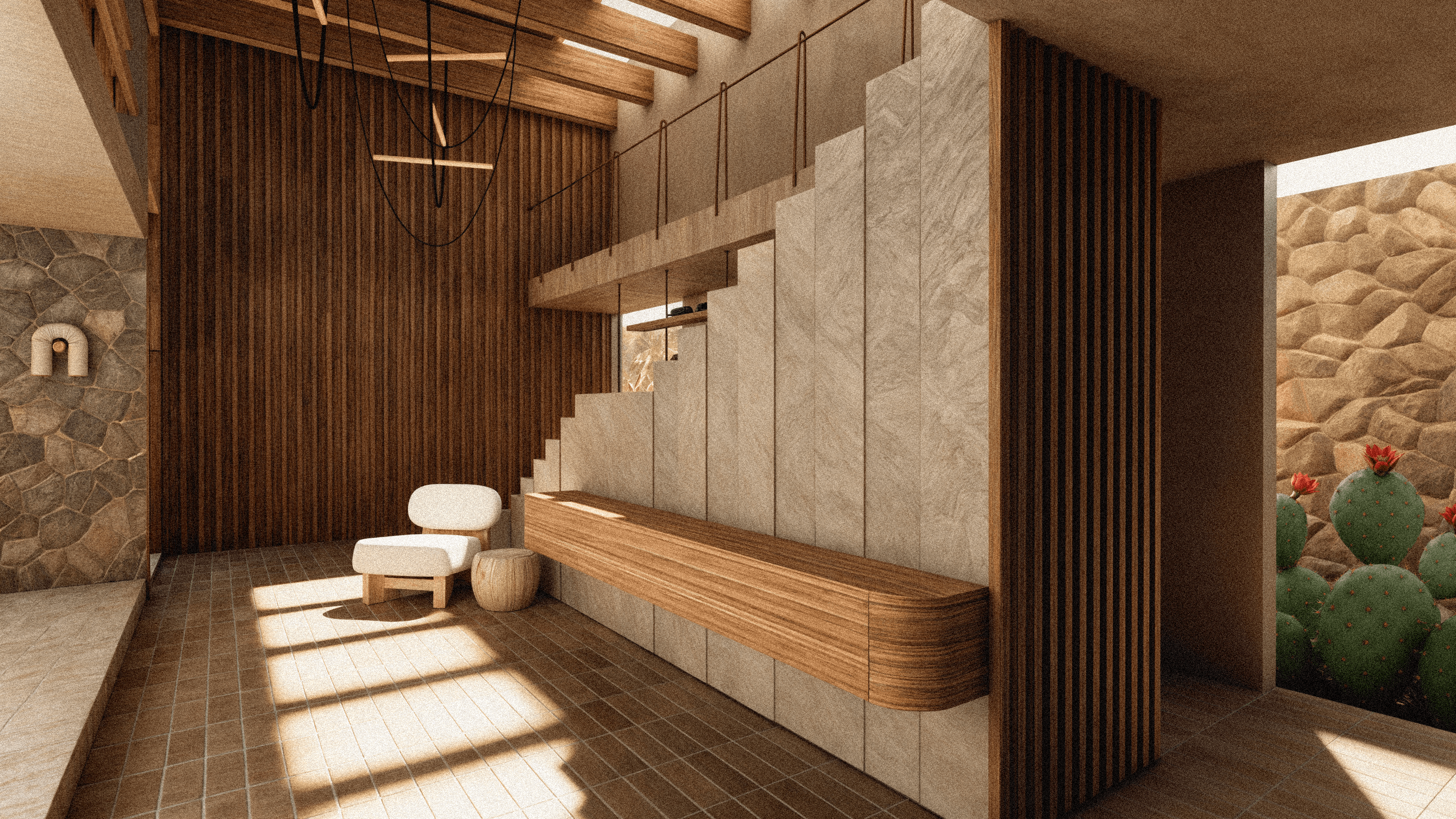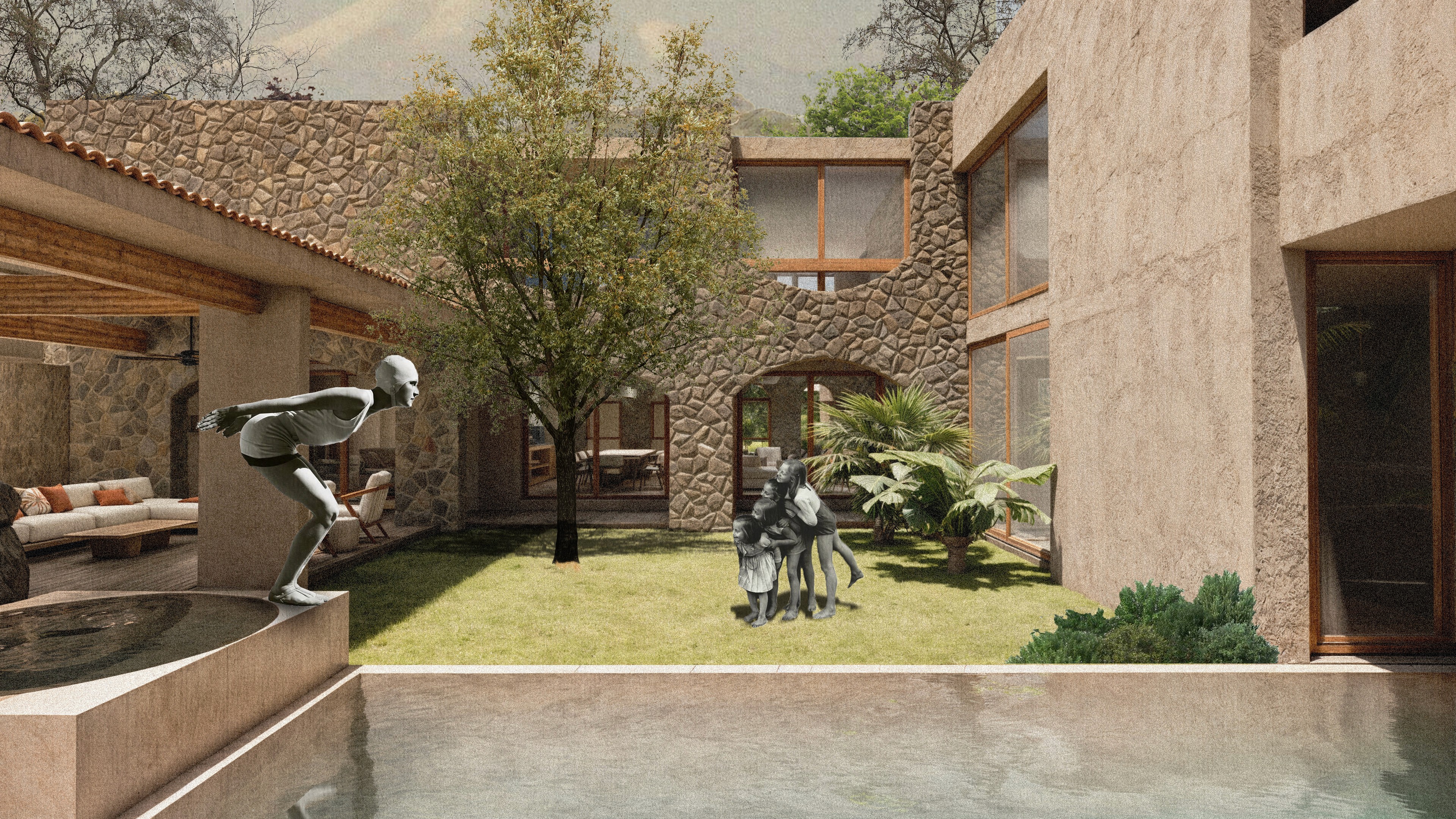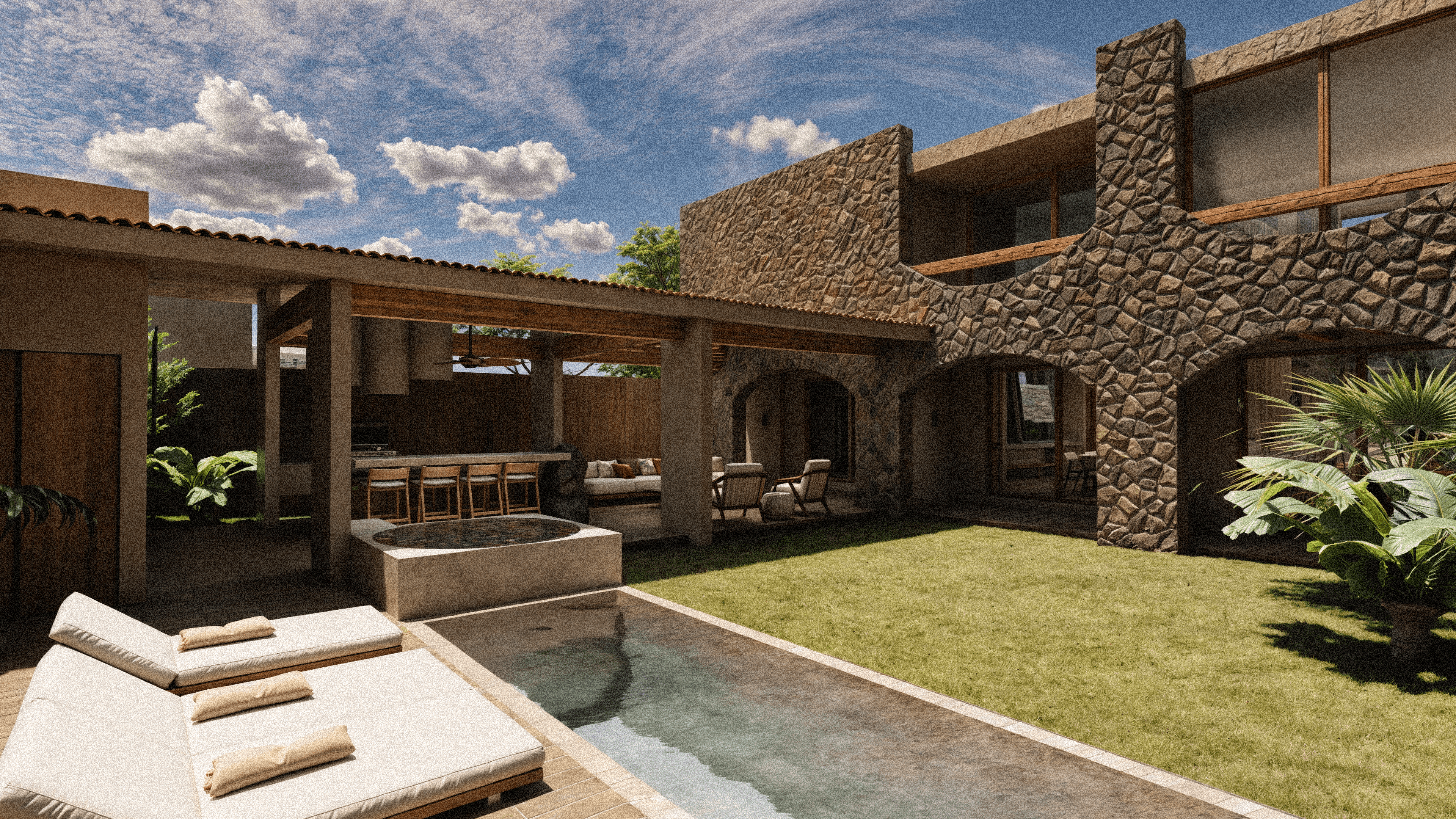 En uno de los residenciales de mayor nivel socio económico de Cuernavaca se diseñó un proyecto que intentó romper estigmas dentro del fraccionamiento. En un terreno con un desnivel amplio y con colindancias con ruido auditivo y visual, el proyecto toma como ejes guia el bloquear esta barrera acústica y visual, aprovechar la orientación y crear distintos grados de privacidad dentro de la propiedad.